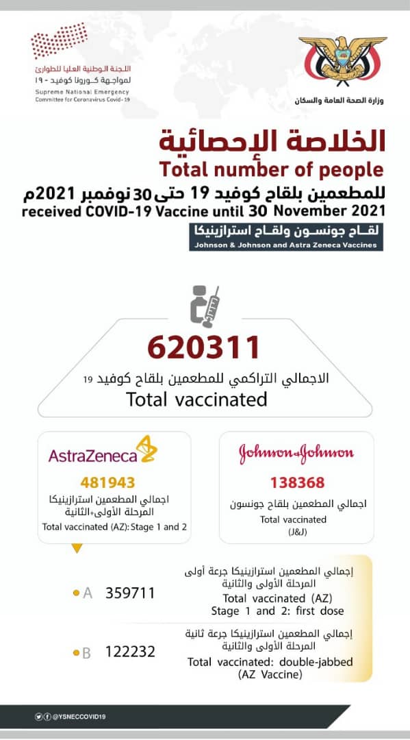 نشر حساب اللجنة الوطنية العليا لمواجهة وباء كورونا، في موقع تويتر، إنفوجرافيك، يتضمن خلاصة بأعداد المطعمين بلقاح #كورونا كوفيد-19، خلال الفترة من 19 حتى 30 نوفمبر الماضي.